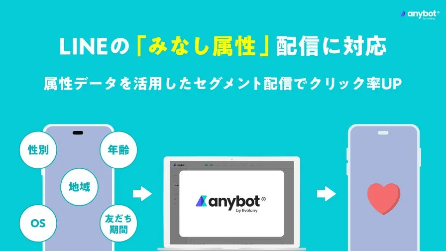 しかし、anybotを活用することで、リッチなメッセージを配信できるだけでなく、「みなし属性」を利用した配信も可能になります。これにより、企業はユーザーからの情報を待つことなく、最初からパーソナライズされたメッセージを送り、ユーザーの関心を引くことができるようになります。