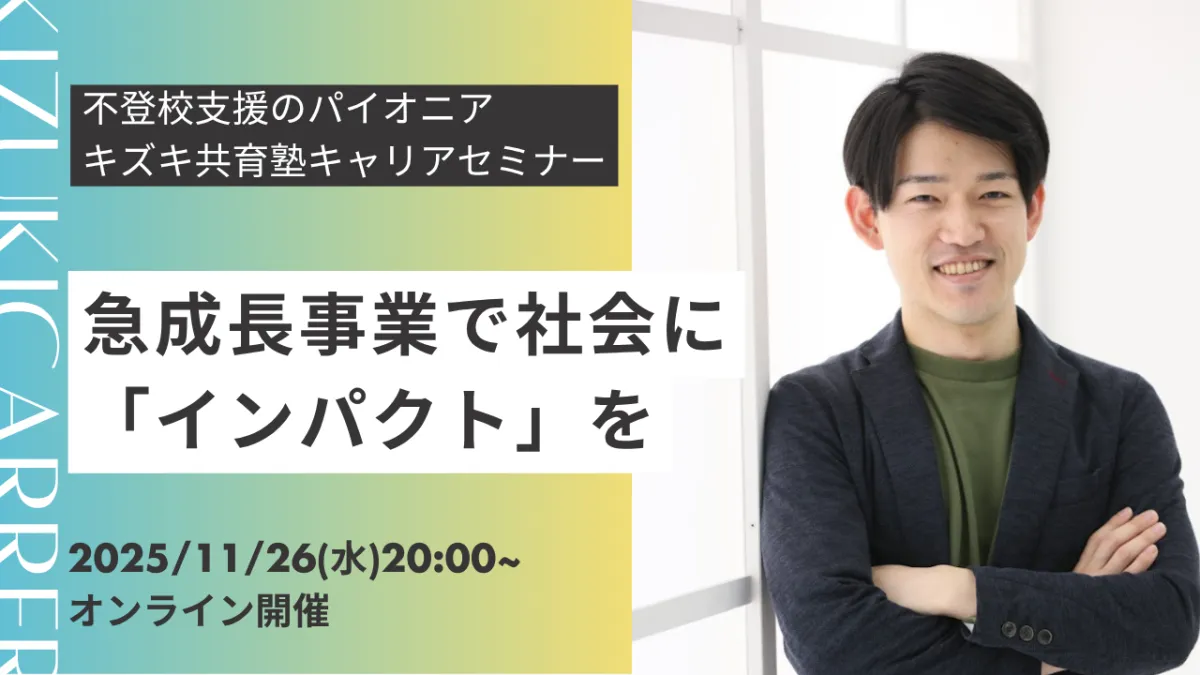 株式会社キズキが運営する「キズキ共育塾」では、2025年11月26日(水)20:00から21:00まで、正社員採用向けのキャリアセミナーをオンラインで実施します。このセミナーは、不登校や発達特性を持つ子どもたちに寄り添い、「何度でもやり直せる社会」を実現するために活動を行っている教育ベンチャー、その取り組みや成長戦略について学ぶ絶好の機会です。