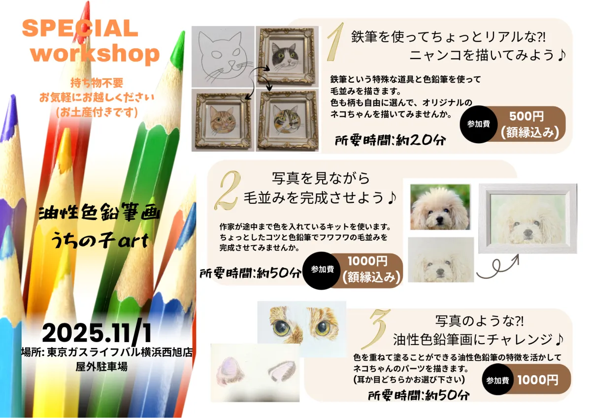 2025年11月1日(土)から11月3日(月)にかけて、横浜市で「KARAKUマルシェ×東京ガスライフバル横浜西旭店」のコラボイベントが開催されます。このイベントに出展するのは、油性色鉛筆画を中心に活動する「うちの子art」です。今回は特別に、愛犬や愛猫の顔をモチーフとしたリアル色鉛筆画のワークショップを用意しました。