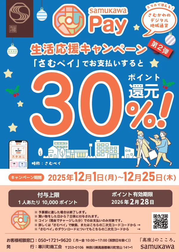 神奈川県寒川町では、地域活性化を目的としたキャッシュレス決済アプリ「さむかわPay」を用いた生活応援キャンペーン第2弾が始まりました。今回は、町民の皆さんだけでなく、町外からの訪問者にも朗報です。さむかわPayを使って、町内の加盟店で買い物や食事をすると、なんと30%のポイントが還元されるのです! 具体的には、1人あたり最大10,000ポイントが還元されるため、お得さは抜群です。