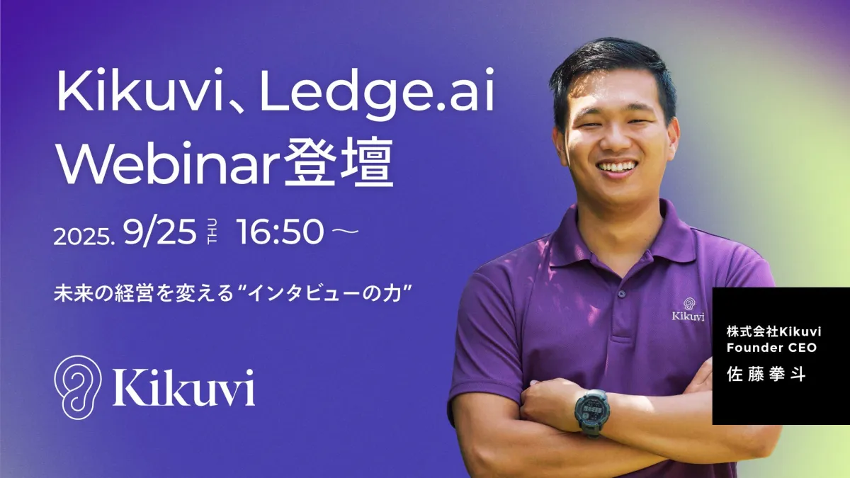 株式会社Kikuvi(神奈川県鎌倉市)代表取締役社長の佐藤拳斗が、2025年9月24日から26日まで開催される「Ledge.ai Webinar SP」に登壇します。今回のセッションでは、特に業務ヒアリングに関する課題とそれに対するAIを活用した解決策について詳しく話します。
