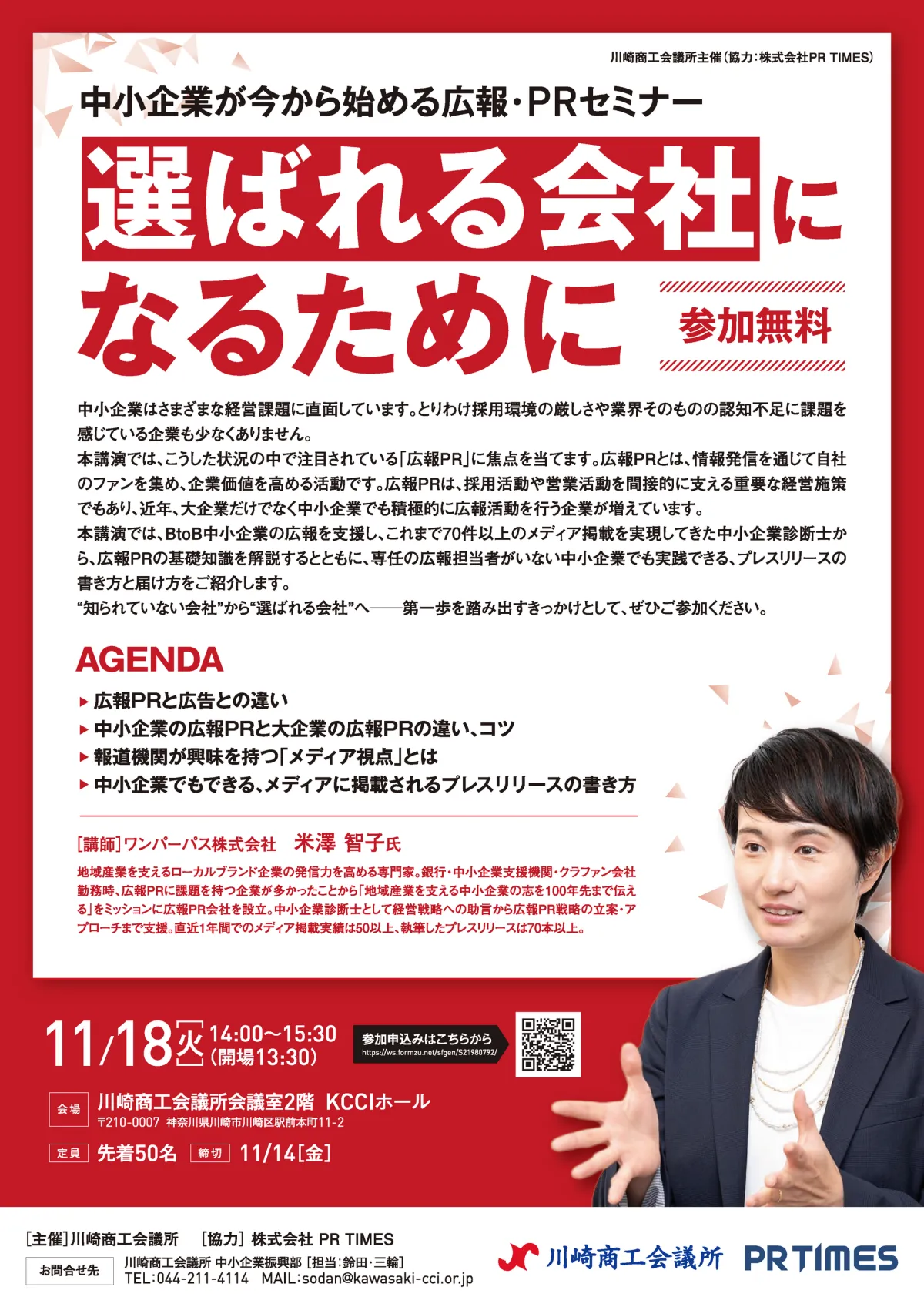 本セミナーは川崎商工会議所が主催しており、株式会社PR TIMESの協力を得ています。広報に関して説明を行う米澤氏は、これまでに多くのメディアに取り上げられる実績を持つプロフェッショナルです。