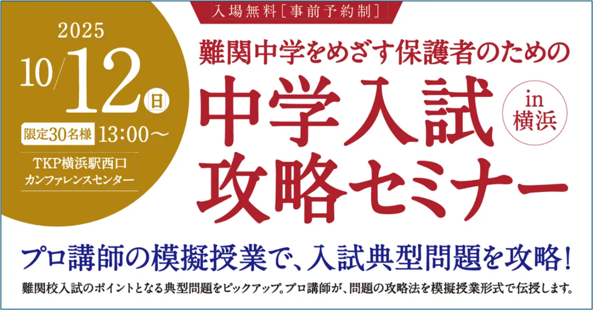 横浜市で、難関中学を目指す保護者のための『中学入試攻略セミナーin横浜』が、2025年10月12日(日)に開催されます。このセミナーは、株式会社名門会が主催し、中学受験についての最新情報やアプローチ方法を豊富な経験を持つプロ教師から学ぶための特別なプログラムです。