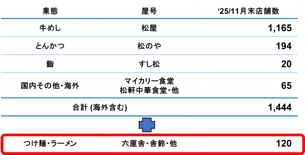 近年、外食市場では個人消費の回復やインバウンド需要の高まりが見られるものの、原材料の高騰や人件費・エネルギーコストの上昇といった厳しい環境も伴っています。こうした背景を受け、松屋フーズHDは「マルチブランドの推進」と「収益構造の高度化」を戦略の中心に据え、ラーメン業態を取り込むことで、業態ポートフォリオを強化し、持続的な企業価値の向上を図ることになりました。