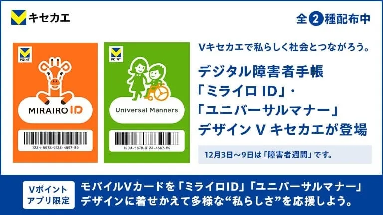 神奈川県横浜市に本社を置くCCCMKホールディングス株式会社(以下、CCCMKHD)は、Vポイントアプリの「Vキセカエ」にて障害者手帳アプリ『ミライロID』と、株式会社ミライロが提唱する『ユニバーサルマナー』のコラボレーションデザインを、2025年12月1日(月)より無料配布することを発表しました。