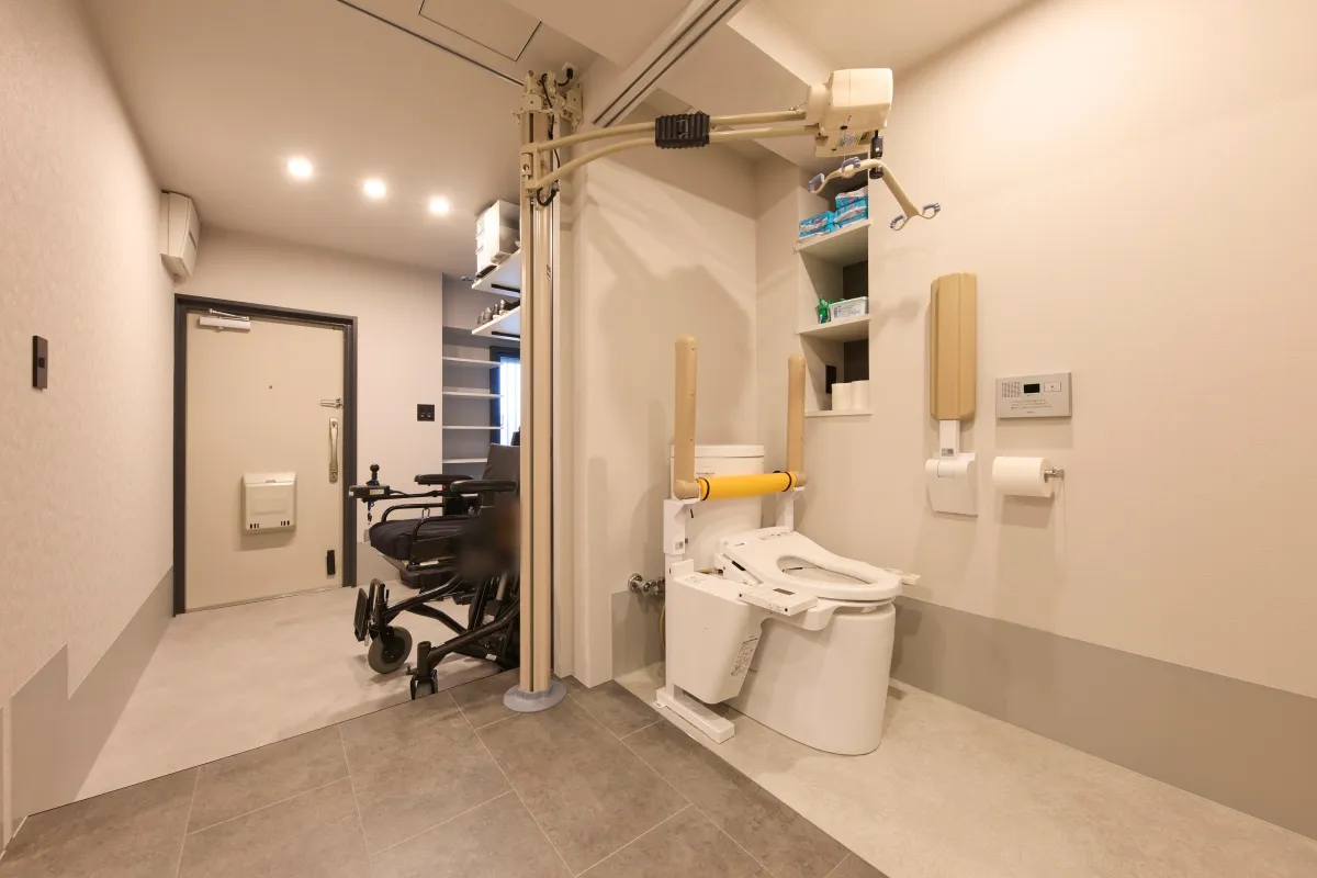 物件では大きなリビングエリアが設けられ、介助者が待機できるスペースも考慮されています。この工夫により、施主様が安心してリラックスできる環境が整えられました。そして、玄関や居室には車いすの乗り換えを容易にするためのリフトが設置されています。