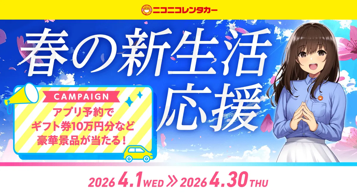 2026年4月、ニコニコレンタカーは、「春の新生活応援キャンペーン」を開催します。これは、新生活をスタートする人を応援するための特別な企画です。期間中に、公式アプリ「ニコパス」を通じてレンタカーを予約・利用すると、抽選で豪華景品が手に入るチャンス。