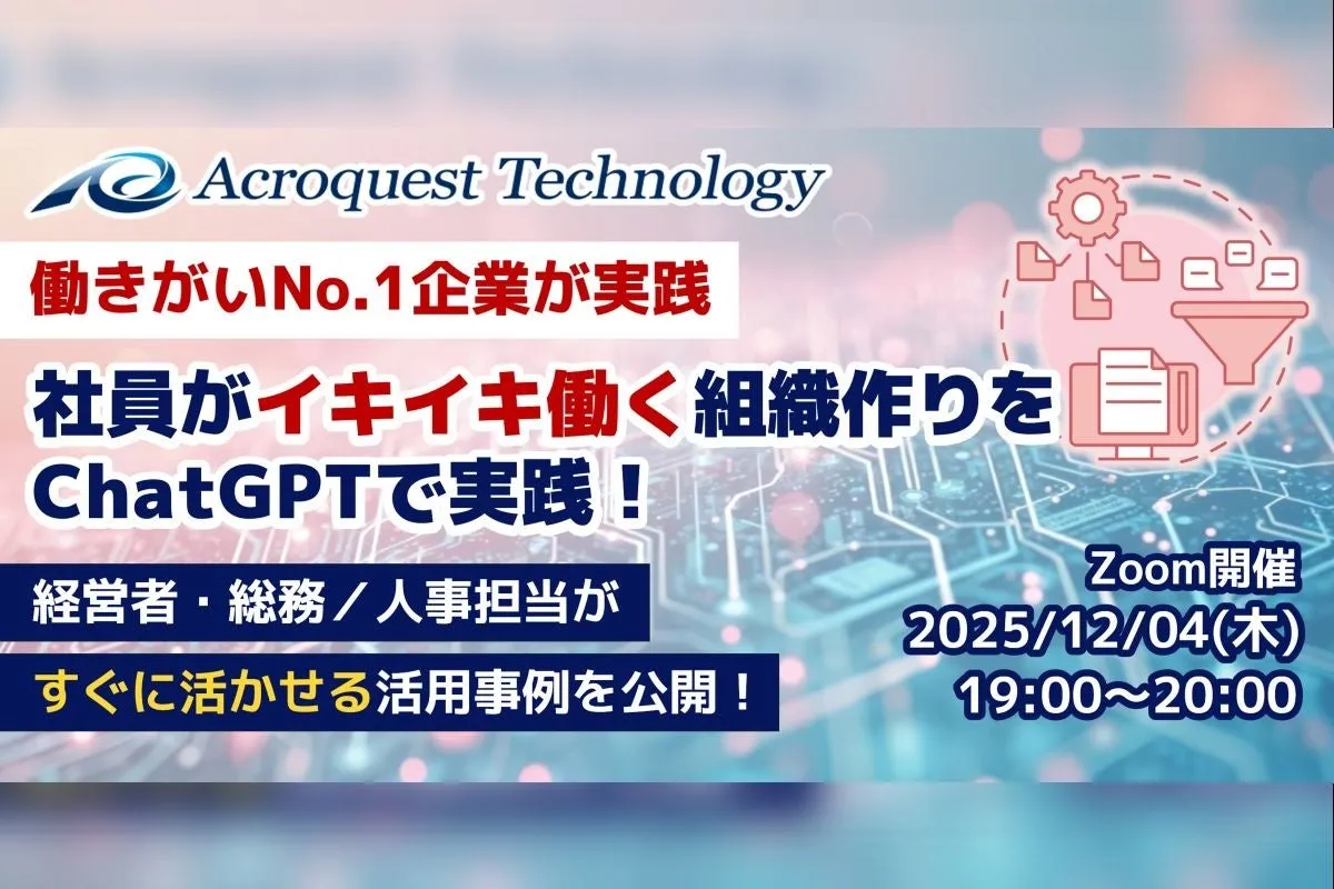アクロクエストテクノロジー株式会社は、中小企業の経営者や人事・総務担当者を対象にしたオンラインセミナー「社員がイキイキ働く組織のChatGPT活用法」を開催します。このイベントは、2025年12月4日(木)に実施され、前回のセミナーに続く再開催となります。 なぜこのセミナーが行われるのか、その背景には多くの経営者からの高評価を受けてのことがあります。