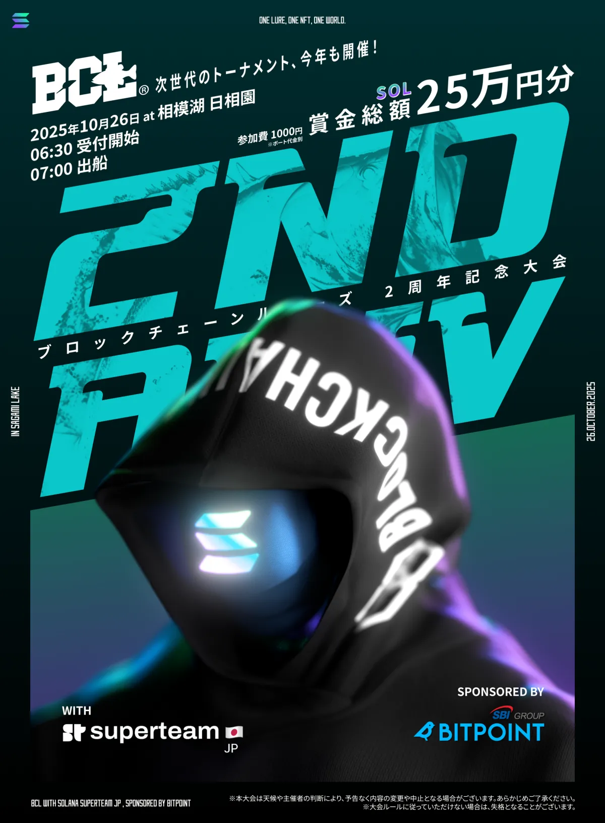 2025年10月26日(日)、相模湖の日相園にて、BCLが展開するアングラー特化型Web3アプリ「BCLアプリ」の2周年を記念したフィッシングトーナメントが開催されます。このイベントは、大人気の暗号資産「SOL」を賞金にした世界初のフィッシングトーナメントです。昨年に続き、参加者にはプロもアマも問わず、最高の釣り体験を提供します。