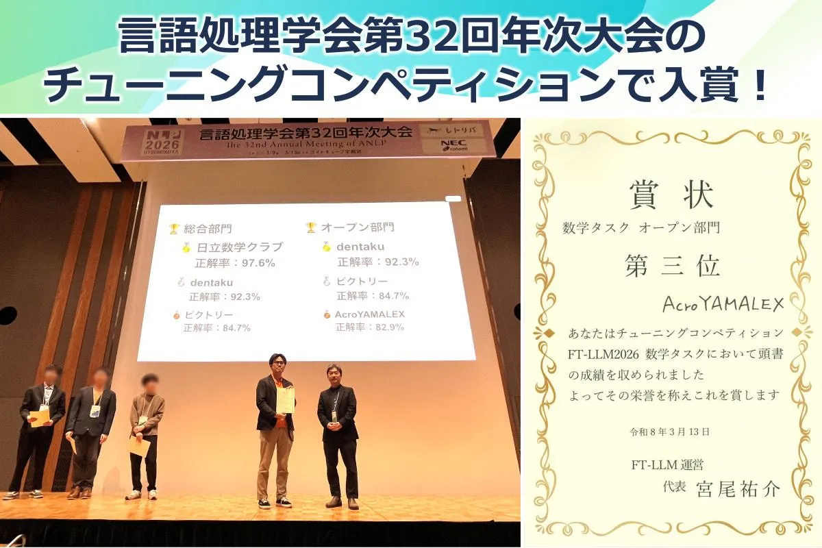 2026年3月に開催された言語処理学会第32回年次大会(NLP2026)。この大会のなかでも注目を集めたのが、アクロクエストテクノロジー株式会社のデータサイエンスチーム、AcroYAMALEX(以下YAMALEX)による成果です。彼らは、第2回「大規模言語モデルのファインチューニング技術と評価」ワークショップで行われたチューニングコンペティションに参加し、数学タスク部門で見事第3位を獲得しました。