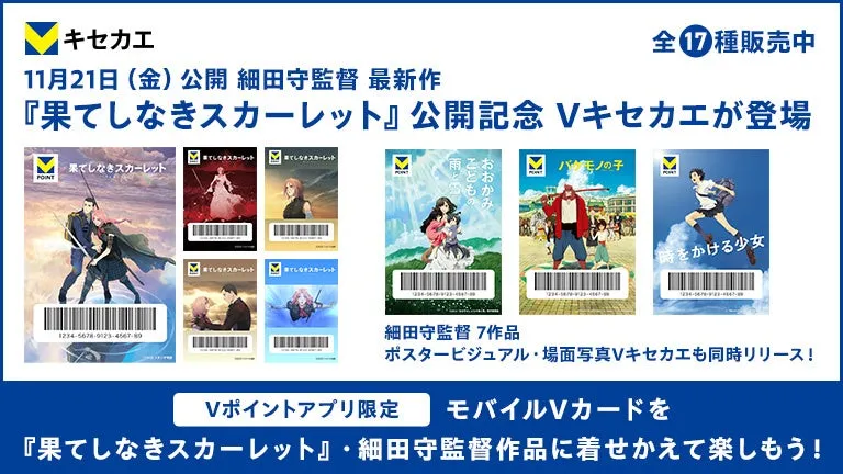 神奈川県横浜市のCCCMKホールディングス株式会社が、細田守監督の新作映画『果てしなきスカーレット』の公開を記念して、特別なイベントを開催します。注目は、Vポイントアプリの「モバイルVカード」で利用できる「Vキセカエ」に、多彩なデザインが登場することです。11月7日から、これまで細田監督が手掛けたアニメーション映画のデザイン全17種が一定期間で配布・販売されます。