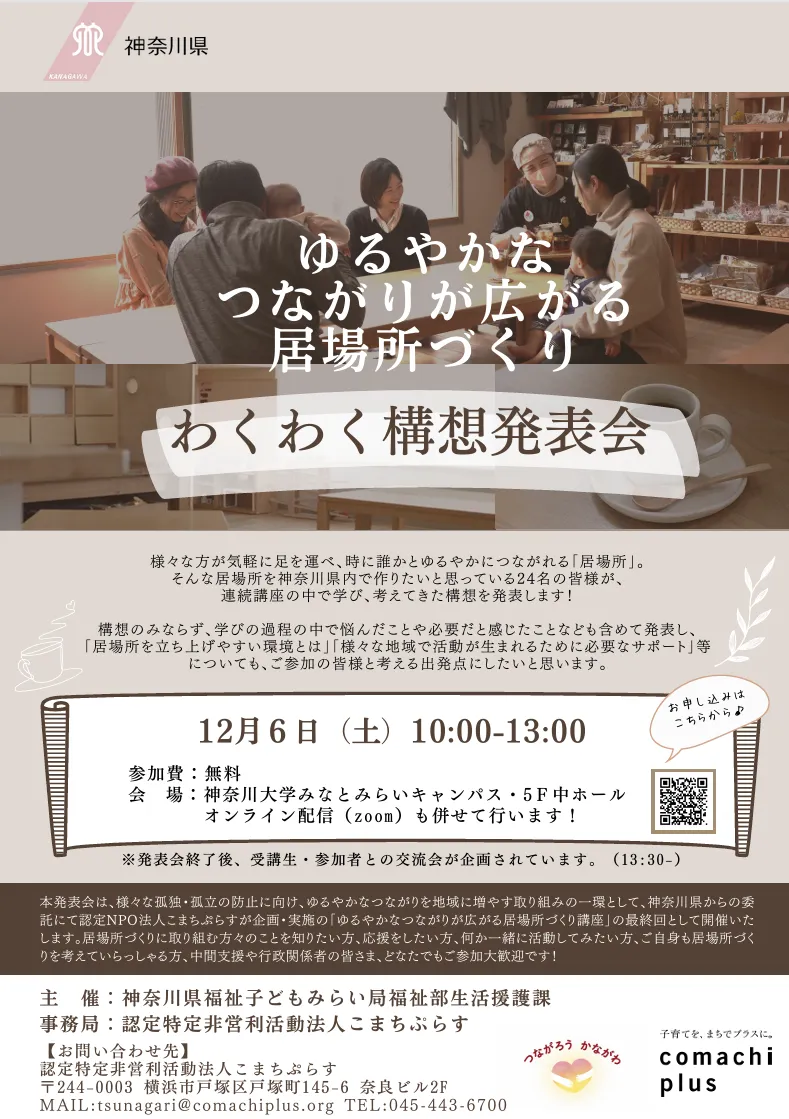 神奈川県にて、地域のつながりを育む「わくわく構想発表会」が2025年12月6日(土)に開催されます。この発表会は、認定NPO法人こまちぷらすによる「ゆるやかなつながりが広がる居場所づくり講座」を受講した24名が、自身の構想を発表する特別なイベントです。