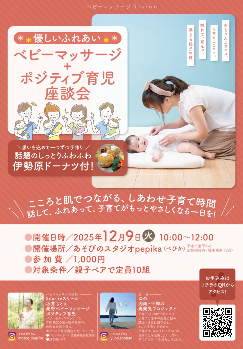 2024年12月9日(火)、神奈川県平塚市にて、地域密着型のまちづくりに取り組む株式会社マッケンジーハウスが主催するベビーマッサージ教室が開かれます。このイベントは、「あそびのスタジオ pepika」で行われ、定員制・無料で0歳から2歳の親子が参加可能です。