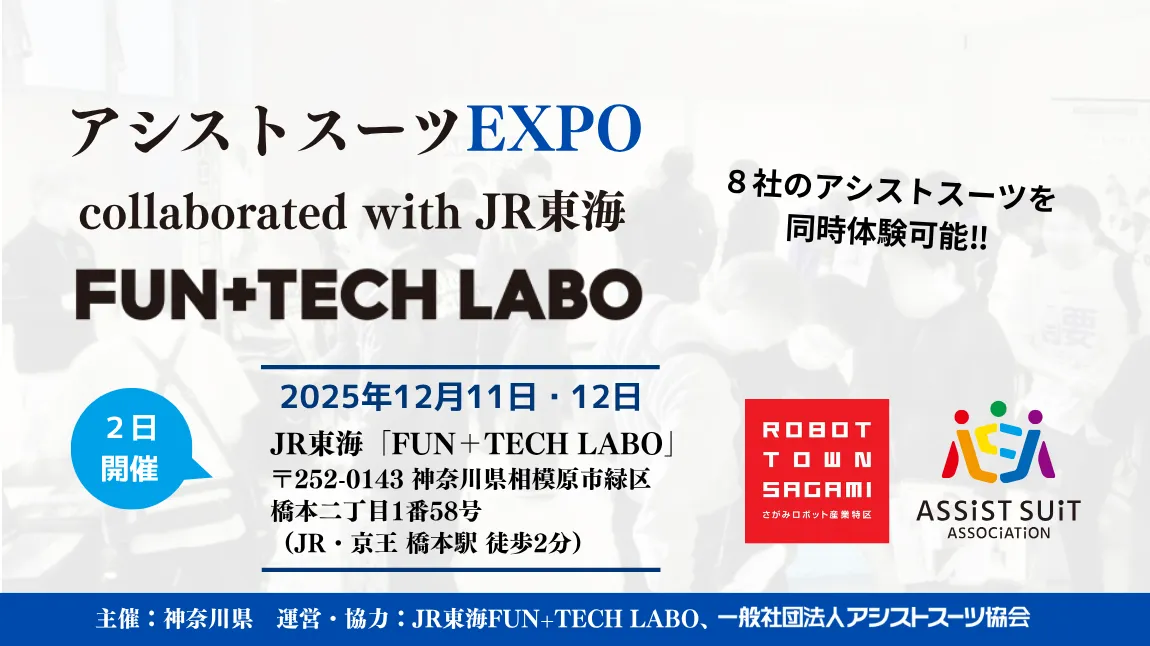 2025年12月11日(木)・12日(金)、神奈川県相模原市の「FUN+TECH LABO」で「アシストスーツEXPO」が開催されます。このイベントは、一般社団法人アシストスーツ協会とJR東海の共同開催で、アシストスーツの導入や活用に関する展示や講演が行われる特別な機会です。