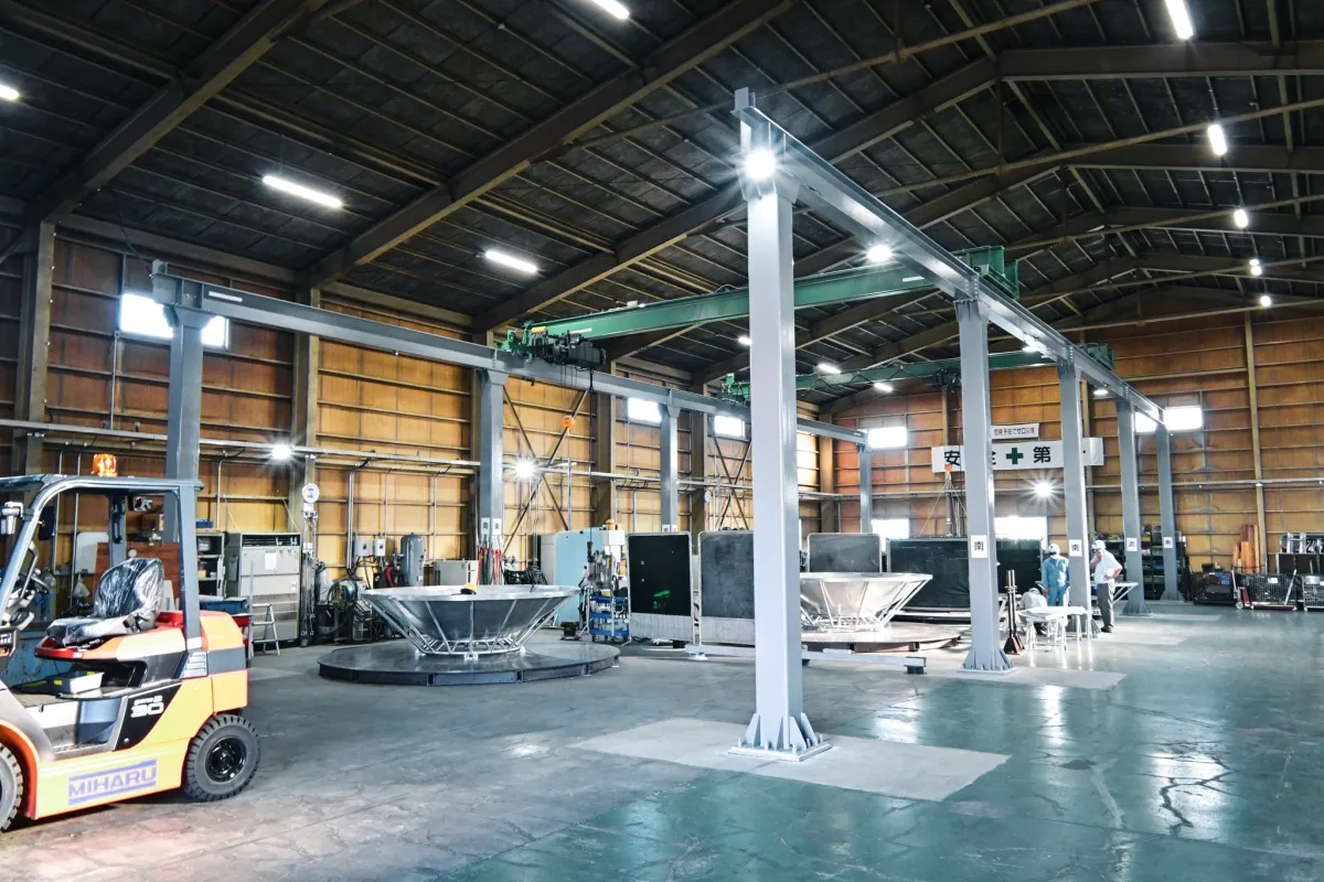 この製造工場では、主に直径3メートルまでのアルミ絞り加工を行い、背面構造の溶接組立を行います。月間で最大20面の生産能力を目指し、耐風速基準をクリアする強度設計を採用しています。特にアルミ溶接は、製品の性能に大きく影響を与えるポイントであり、熟練した職人による精密作業が鍵を握っています。そして、何よりも品質と安全を重視し、日本国内でもトップレベルの技術力で製造が行われています。