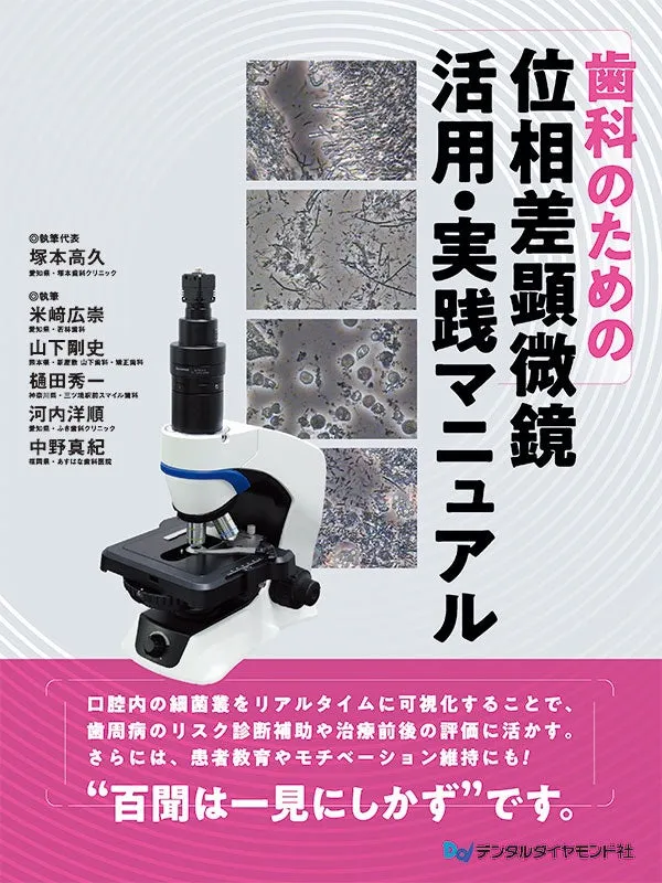 この書籍は、国際歯周内科学研究会の代表理事である塚本高久先生を代表執筆者とし、樋田院長を含む6名の歯科医師によって共同執筆されました。歯科において「位相差顕微鏡」が持つ利点を最大限に引き出し、治療にどのように役立てるかが詳述されています。従来、位相差顕微鏡に特化した書籍は存在せず、この度の発刊は多くの歯科医療従事者にとって待望の一冊と言えるでしょう。