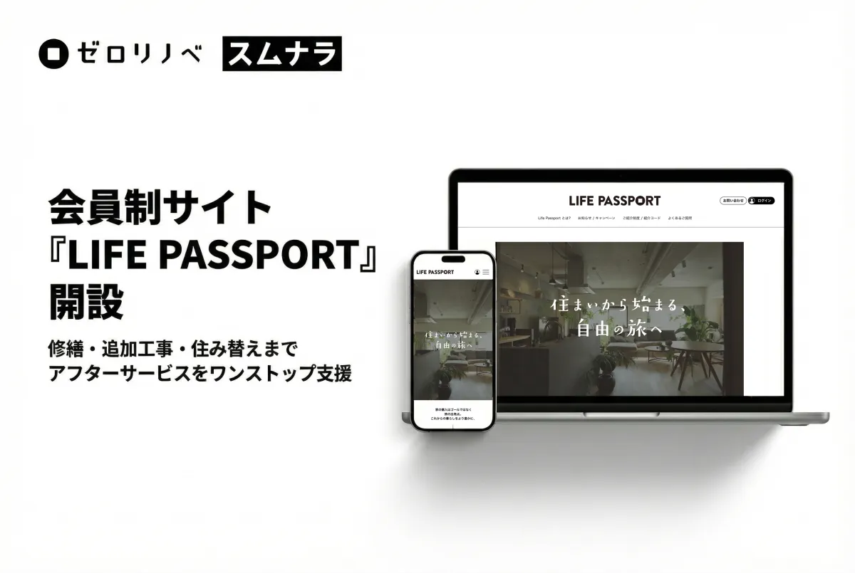 「LIFE PASSPORT」は、同社が提供する「ゼロリノベ」と、特に中古物件を対象としたポータルサイト「スムナラ」を利用したお客様向けに開設されました。これは、住まいの引き渡し後も安心して生活できるよう、長期的なサポートを保証することを目的としています。