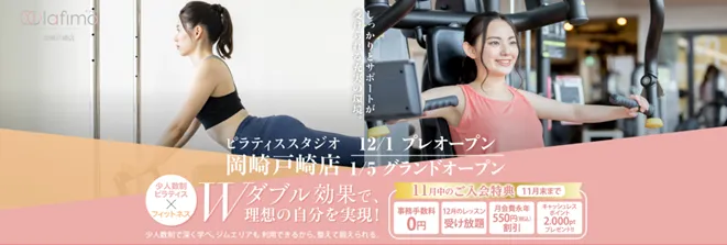 新しいフィットネス体験を提供する『lafimo』の店舗が岡崎にオープンします。運動だけでなく、心のケアや美容、健康をトータルでサポートするプログラムが魅力です。ぜひ、初めての方も、継続中の方もこの機会に新しいステップを踏み出してみてはいかがでしょうか。