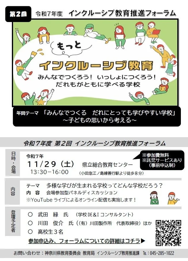 今年度、第2回インクルーシブ教育推進フォーラムがいよいよ開催されます!日時は、令和7年11月29日(土曜日)午後1時30分から4時まで、場所は神奈川県立総合教育センターです。このフォーラムのテーマは「みんなでつくるだれにとっても学びやすい学校~子どもの思いから考える~」。25日に設けられたパネルディスカッションでは登壇者と参加者全員が一体となり、これからの学校教育について意見を交わします。