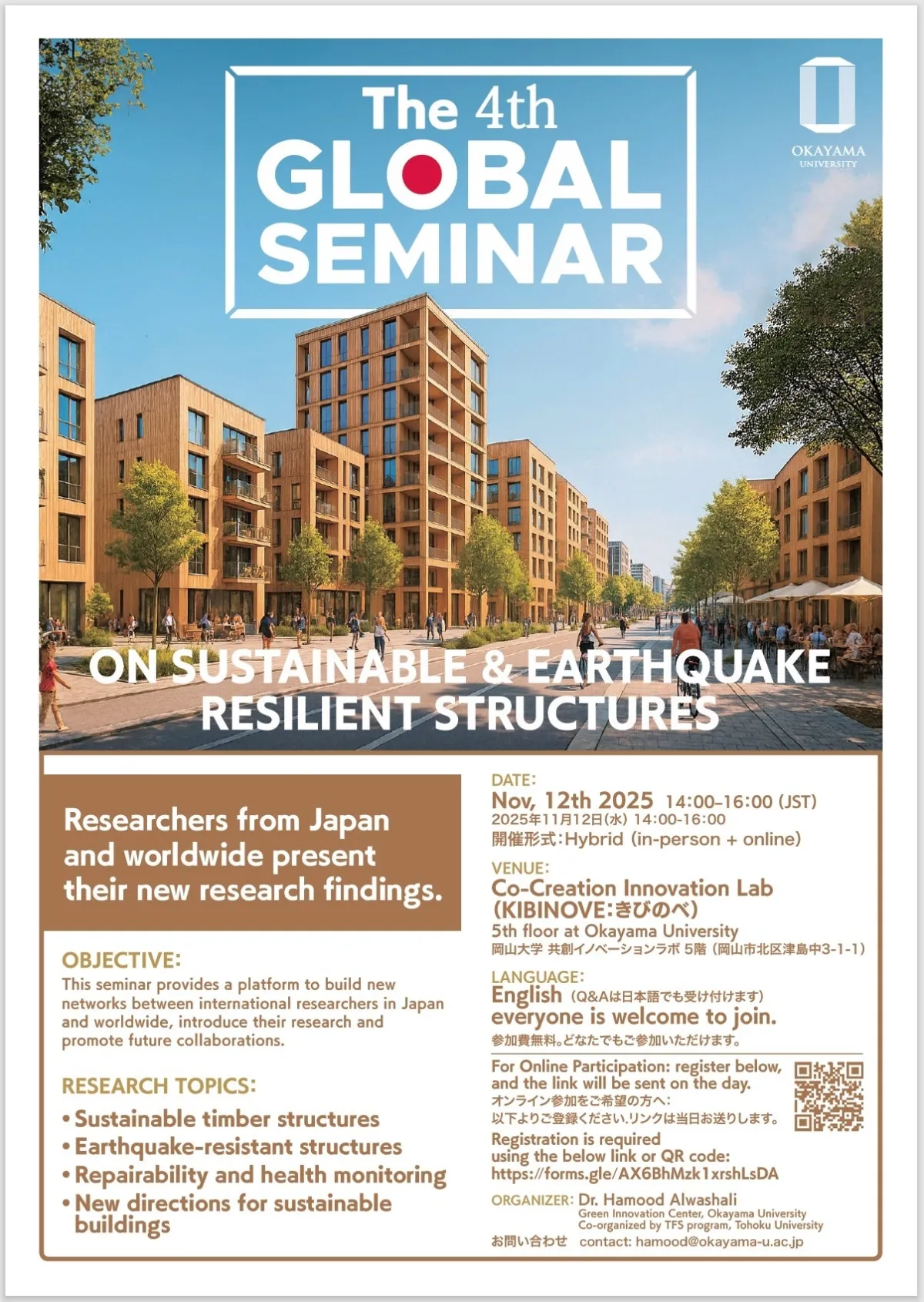 2025年11月12日、岡山大学の津島キャンパスにおいて、「The 4th GLOBAL SEMINAR ON SUSTAINABLE & EARTHQUAKE RESILIENT STRUCTURES」が開催されます。この国際的なイベントは、持続可能な建築物と地震耐性の高い構造設計に関する最新の研究成果や知見を共有する場として、多くの関心を集めています。