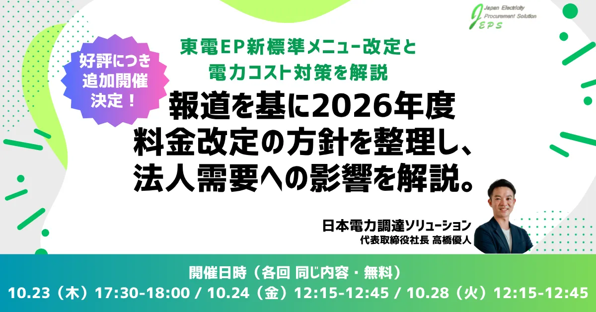 東京電力エナジーパートナー(以下、東電EP)による新標準メニューの料金改定に関する無料オンラインセミナーが、好評につき追加開催されることが決まりました。このセミナーは、法人向けに電力契約および再生可能エネルギー調達の支援を行っている株式会社日本電力調達ソリューションが主催しています。特に、オフィスや商業施設、不動産オーナーや工場など、多様な業種の法人様には非常に重要な内容が盛り込まれており、参加をお勧めします。