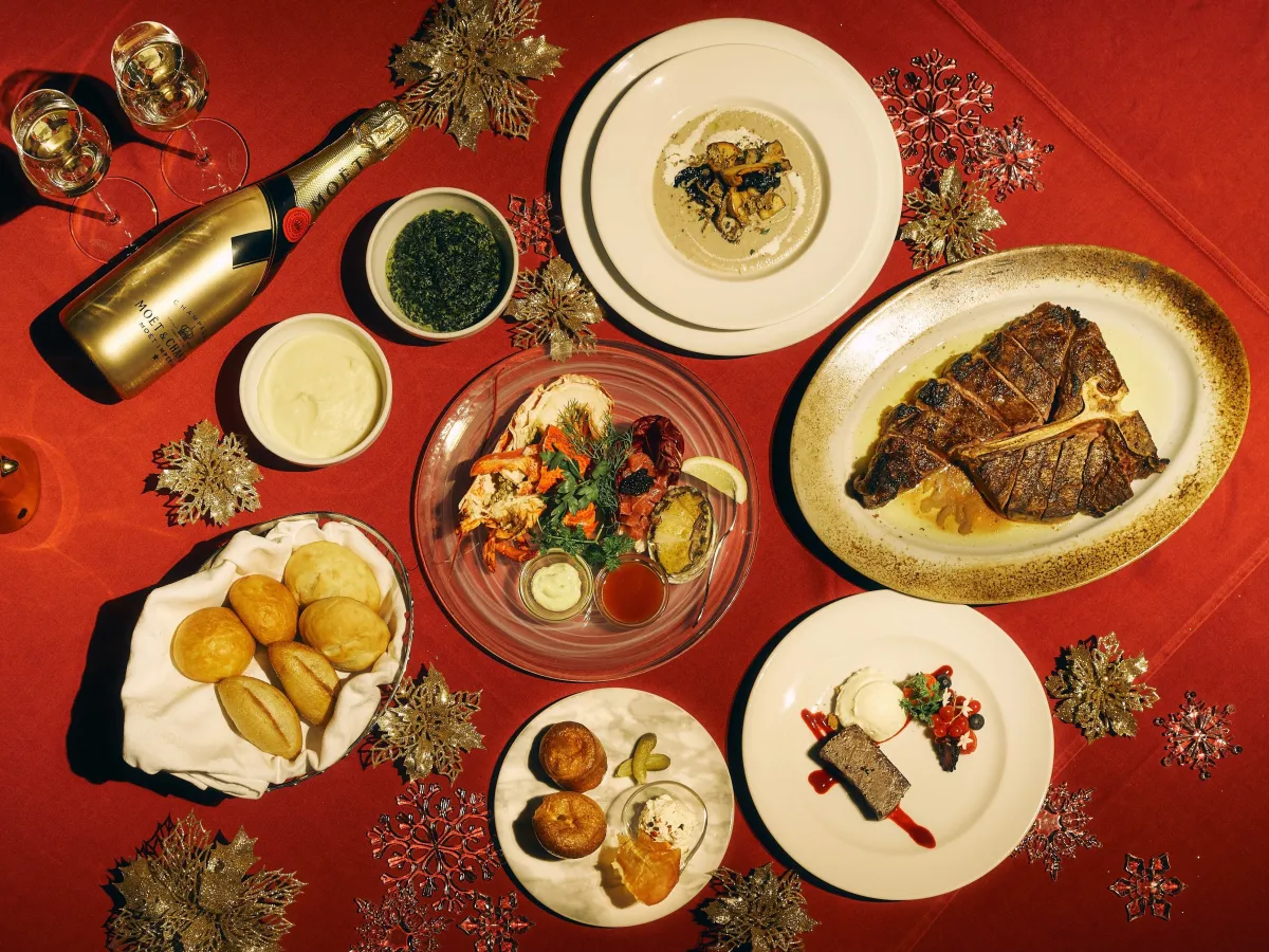 コース内容:アミューズ、海鮮のシーフードプラッター、トリュフ風味の森のきのこスープ、USプライムTボーンステーキ、クリスマスショコラテリーヌなど、多彩な美食が揃います。特に、ディナータイムには生演奏も予定されています。