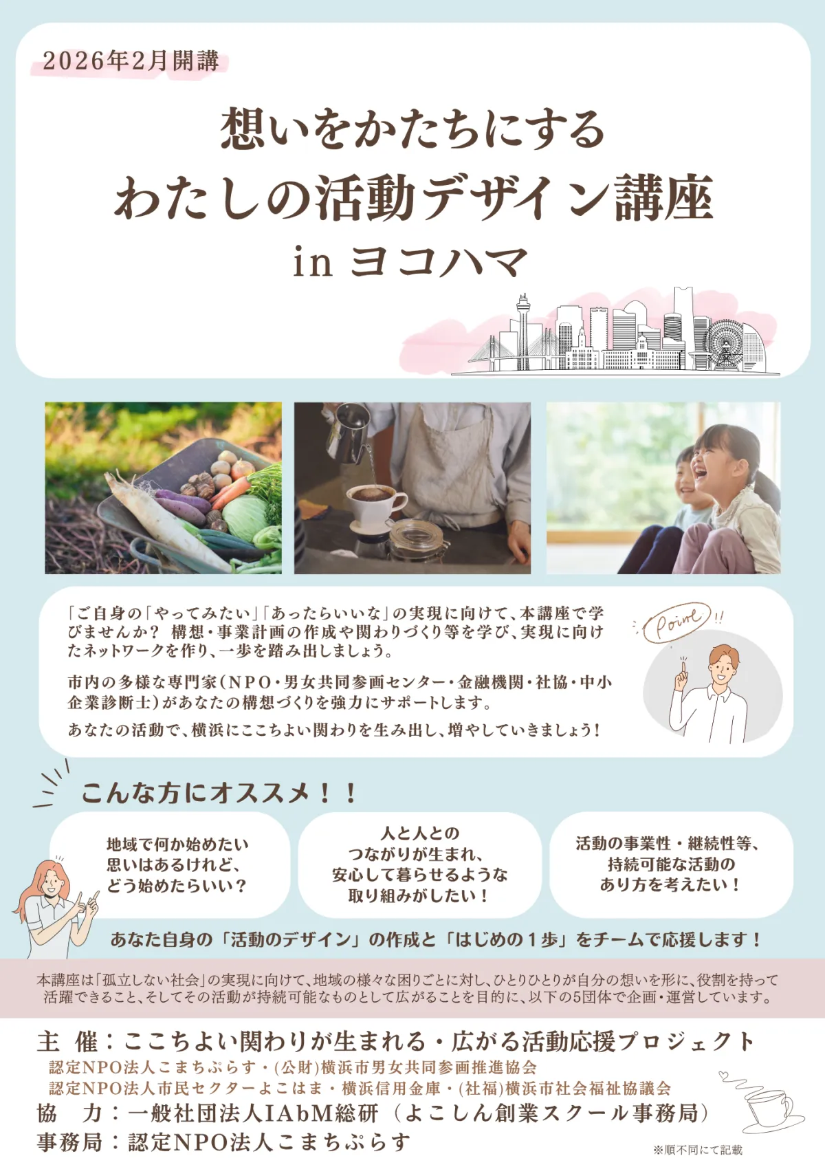 横浜市内で、「孤立しない社会」の実現を目指す「想いをかたちにするわたしの活動デザイン講座」が開催されます。この講座は、認定NPO法人こまちぷらすが中心となり、地域でのつながりを大切にしながら、子育てを支える力を育むことを目的としています。