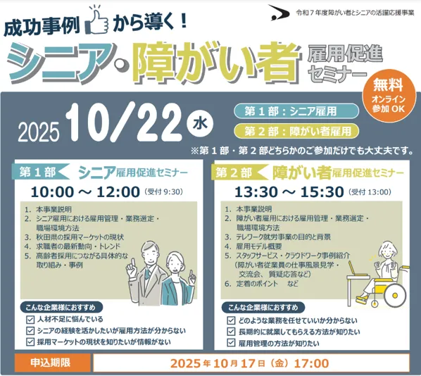 企業向けのイベントでは、シニアや障がい者を雇用するための理解を深めるセミナーが行われます。これには、働き方の新たな知識や雇用管理、職場環境の整備に必要なノウハウなどが含まれます。特に、秋田県内の企業がシニアや障がい者雇用に対する理解を深め、より積極的に雇用を進めることを目指しています。