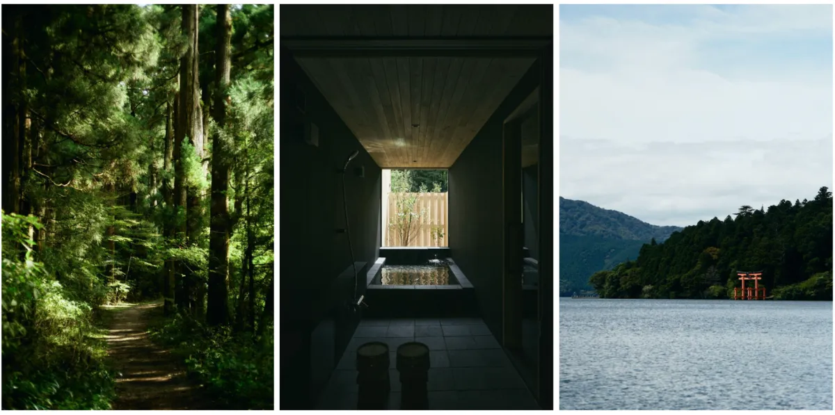 「GEOSPOT MOTOHAKONE」のデザインは、箱根権現の門前町という歴史ある土地柄を反映しています。外観には杉材が使われており、経年変化による色合いや質感が加わり、落ち着いた雰囲気を醸し出しています。室内では自然素材がふんだんに使われ、リビングやベッドルームからは緑豊かな庭が望め、訪れる人々を贅沢に迎え入れています。また、箱根で活躍する作家によるアートや地域の土を用いた左官作品も展示され、独特の美しさを添えています。