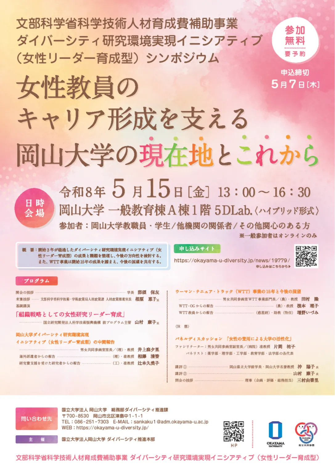 - - 申し込み方法: 岡山大学のダイバーシティ推進本部のウェブサイトからお申し込みが可能です。締切は5月7日(木)です。詳細はこちらです。