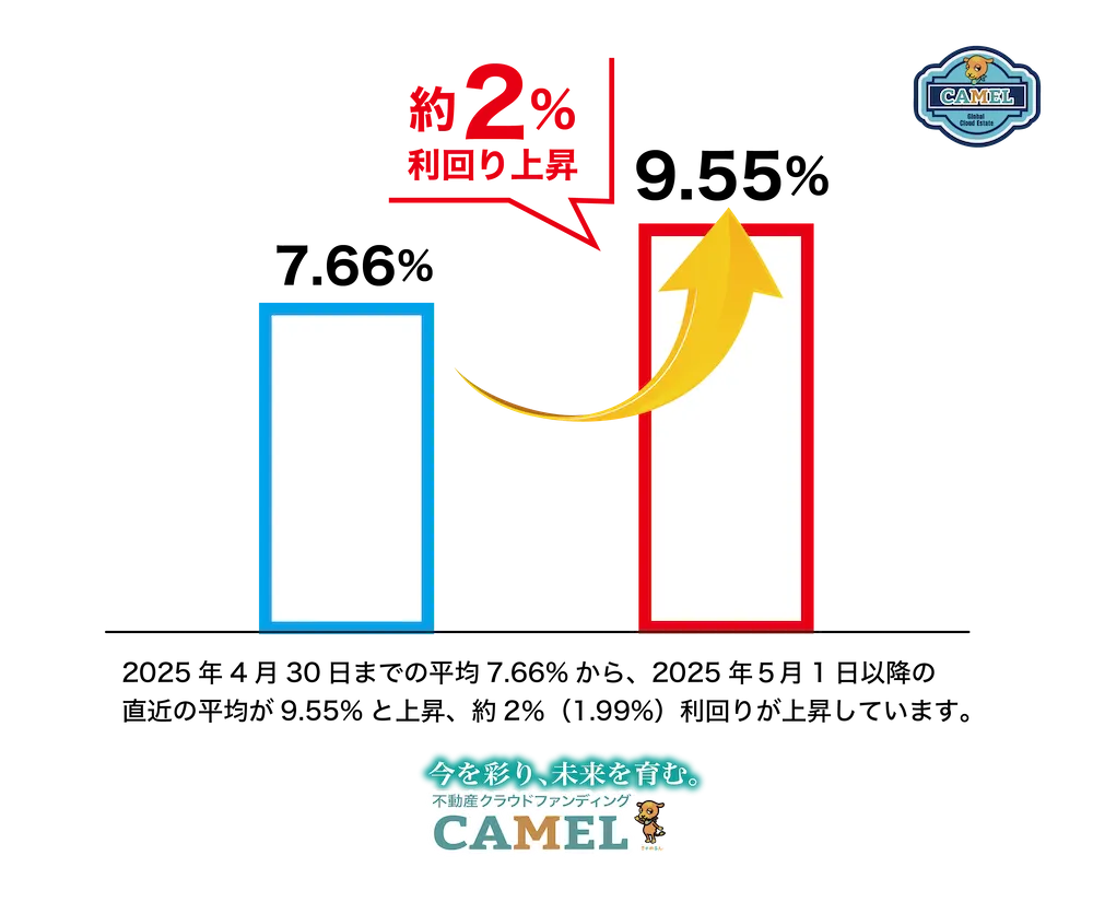 神奈川県川崎市に本社を置く株式会社グローバルクラウドエステートが運営する、不動産クラウドファンディング『CAMEL』が注目を集めています。このサービスは、個人が少額から不動産投資を始められる新しい方法として、多くの投資家に支持されています。最近発表されたニュースによれば、2025年4月30日までの平均利回りが7.66%から、2025年5月1日以降には9.55%に上昇しました。この数値は、たったの約2%の利回り上昇を意味しています。