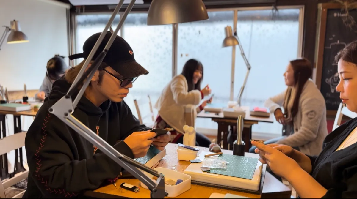 イベントでは、参加者が実際に自分の手で革を縫い合わせていく楽しさが体験できました。写真には、初めて革に触れる若者が工具に夢中になっている姿や、集中して仕上げ工程に取り組む大人たちの様子が収められています。こうした空間には、ものづくり特有の静けさと、時折聞こえる笑い声が混ざり合い、温かい時間が流れました。