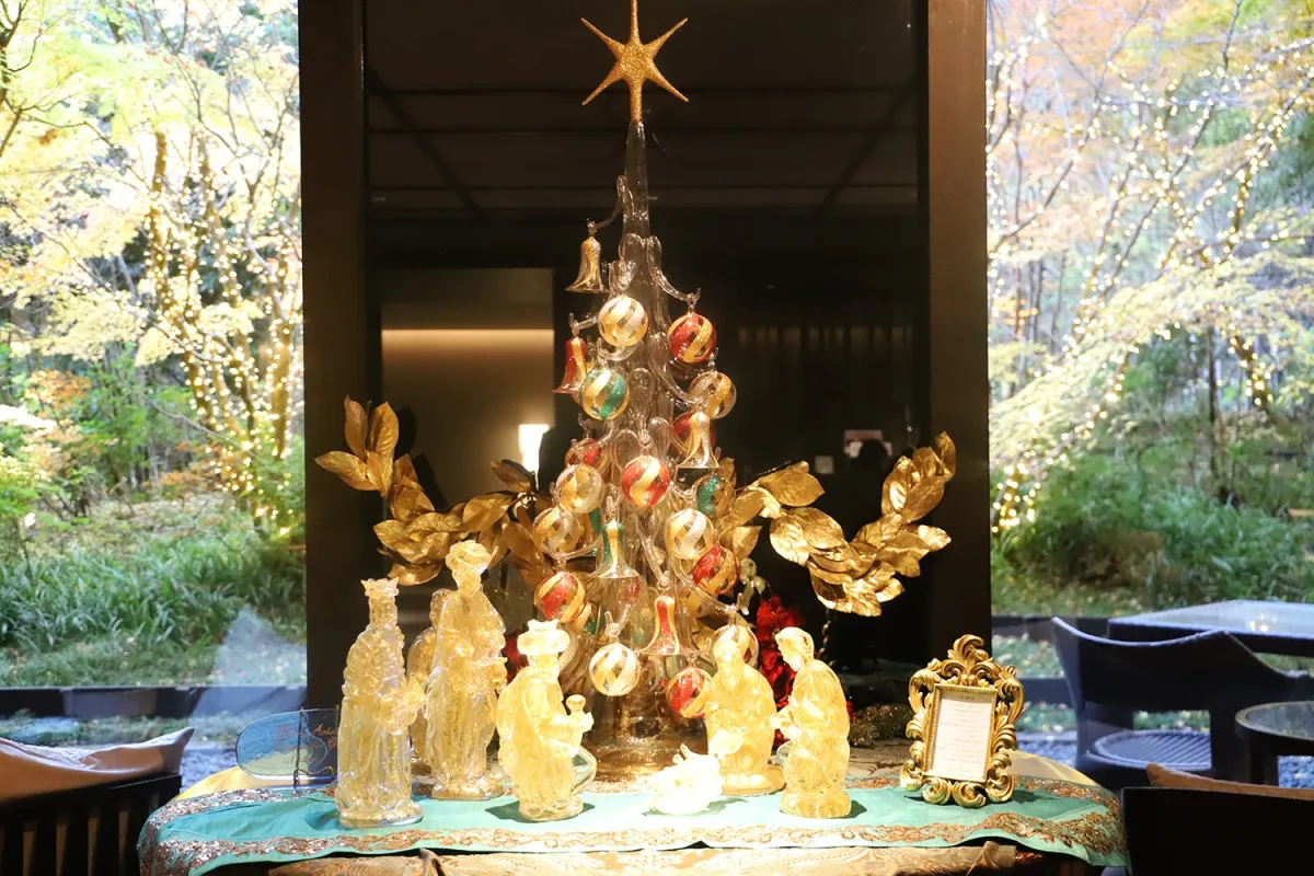 コラボレーションでは、箱根ガラスの森美術館が所蔵する多種多様なヴェネチアン・グラス作品や、冬のシンボルである「プレゼピオ」を「天悠 The Bar & Lounge」で展示します。プレゼピオは、中世のクリスマスにおいて重要な装飾品で、ガラス製の聖人形が特に有名です。19世紀以降、この伝統はムラーノ島で受け継がれ、現在でも多くの人々を魅了しています。小さなガラス人形たちが演出する温かな物語の数々は、冬のひとときをより特別なものにしてくれるでしょう。