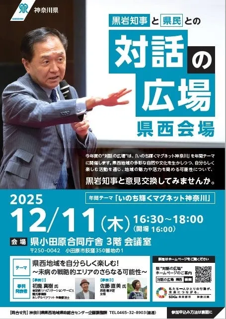 黒岩知事と県民との「対話の広場」が12月11日(木曜日)16時30分から小田原市の県小田原合同庁舎にて開催されます。テーマは「県西地域を自分らしく楽しむ!~未病の戦略的エリアのさらなる可能性~」で、多彩な自然や文化を活用しながら、地域の魅力を引き出すための意見交換を行います。