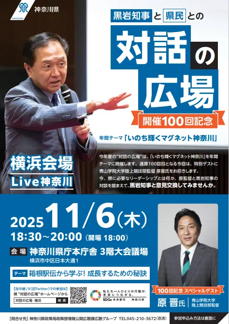 イベントでは、黒岩知事によるオープニング挨拶からスタートし、その後に原晋監督との対談が行われます。お二人の話を基に、会場の参加者がディスカッションに参加できる流れとなっています。これは県の未来やリーダーシップの在り方を考える、貴重な機会です。