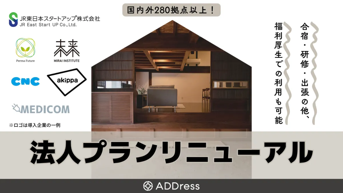多拠点居住の新しい選択肢として注目を集めるADDressが、法人向けプランをリニューアルしました。これにより、企業が出張や研修、合宿などで利用できる月額固定費ゼロのフレキシブルなサービスがスタートしました。ADDressは、全国に280軒以上の物件を持ち、さまざまな目的やスタイルに合わせて利用可能です。