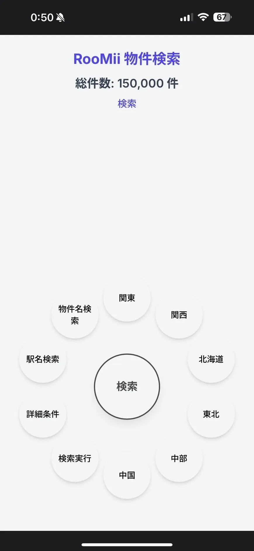 初期画面では、エリアや物件名、詳細条件が中心から円形に配置されます。例えば、不動産検索の画面では、地域を指定するだけで、関連する物件がリアルタイムに反映されます。ユーザーは一タップで次のステップへ進め、効率的に検索を進めることができます。
