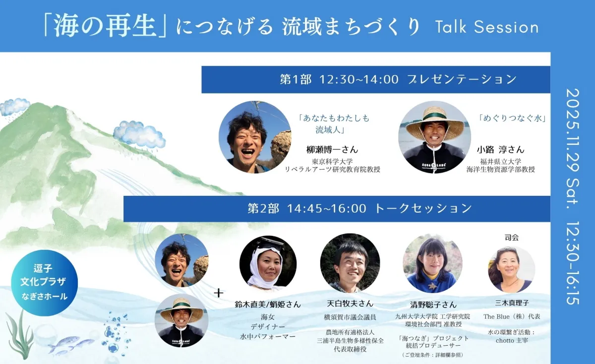 2025年11月29日、逗子文化プラザ なぎさホールにて、「『海の再生』につなげる流域まちづくりトークセッション」が開催されます。本イベントは、海洋環境の再生をテーマに、専門家や実践者たちが集まり、流域からの取り組みと言う視点から水の循環について議論を深める場です。