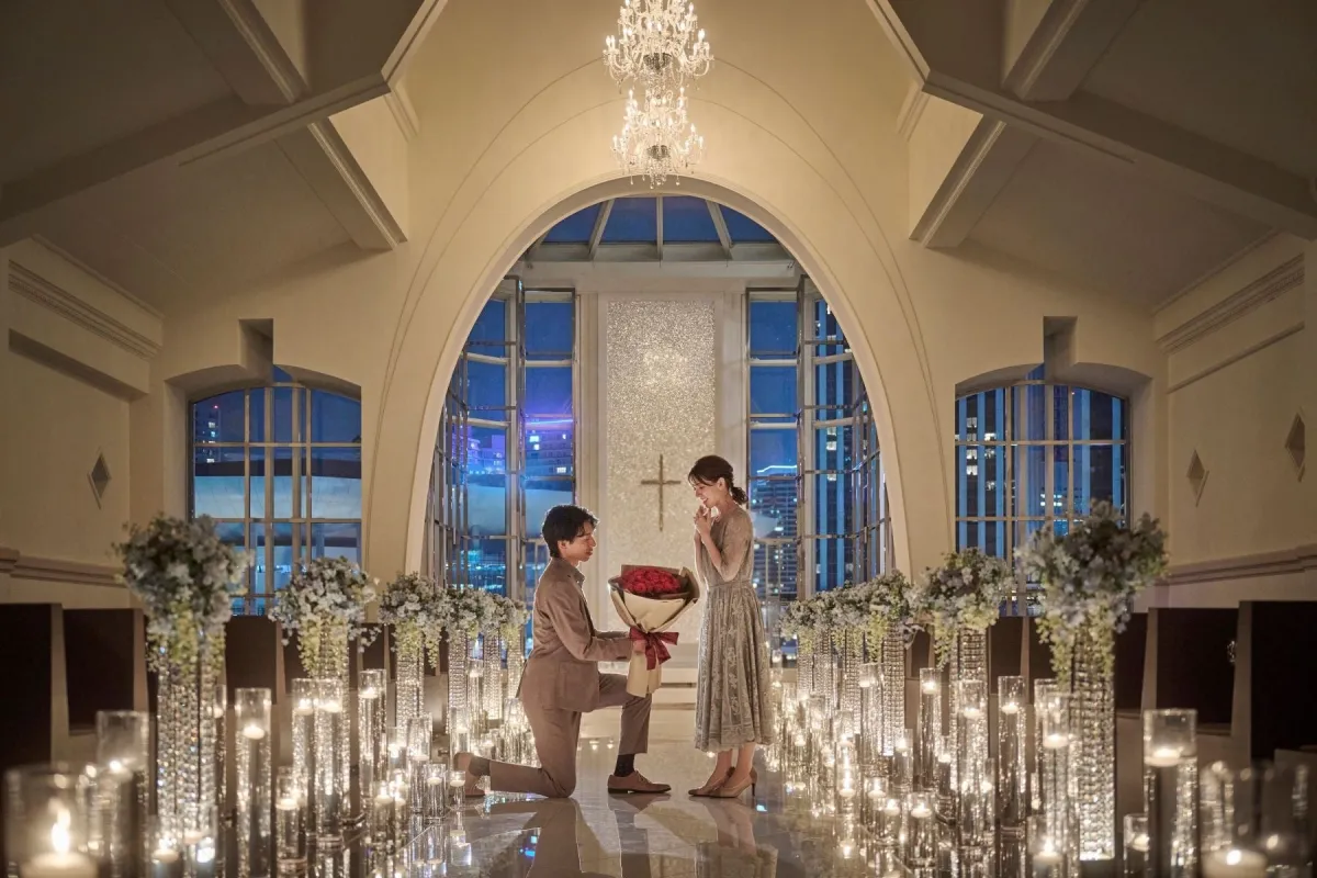 このプロポーズプランは、2025年12月1日から12月25日までの限定期間中に提供されます。美しいみなとみらいの夜景を背景にしたガラスのチャペルが、その舞台となります。キャンドルの灯りが照らす20メートルのバージンロードを歩くと、まるで映画の主人公気分に。祭壇にはマザーオブパールが施され、訪れるふたりを特別な空間へと誘います。