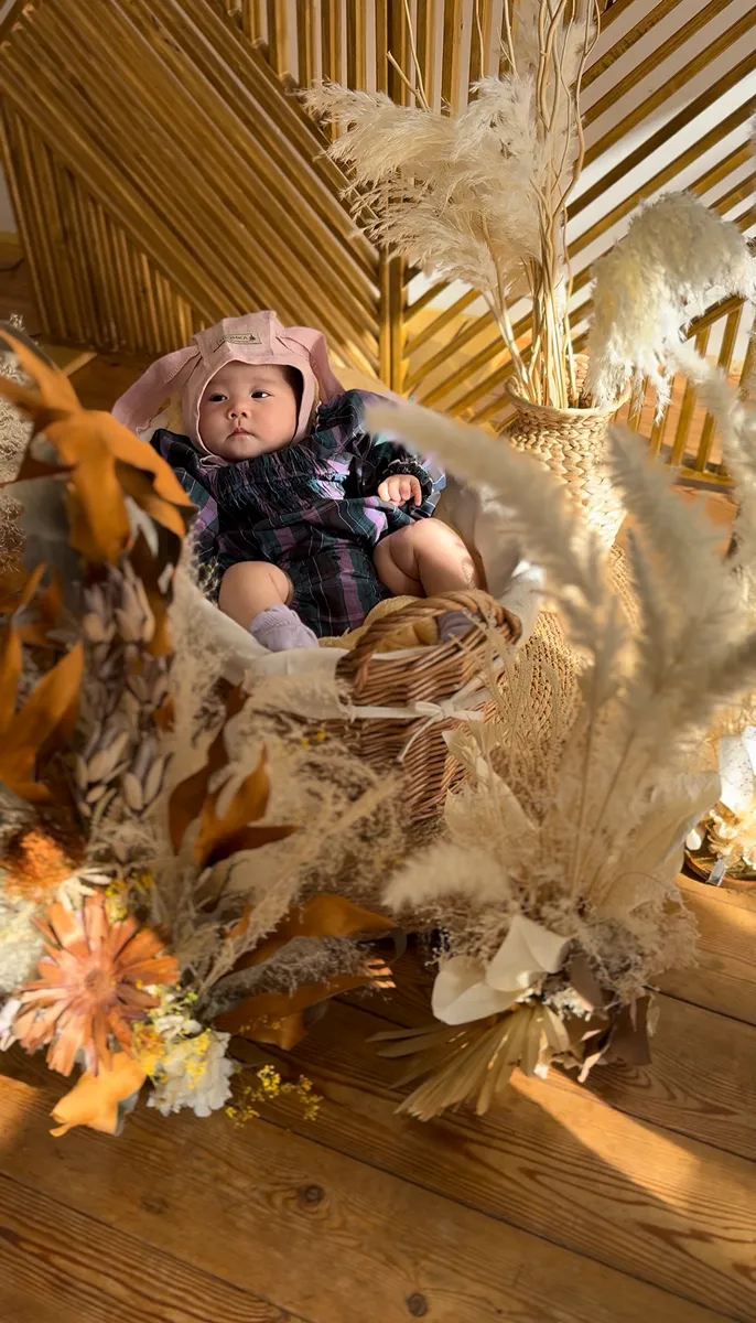 撮影では、赤ちゃんを優しく包むバスケットや、花冠をつけた子どもが微笑む姿、家族が寄り添うほっこりした瞬間など、家族ごとに異なる素敵なシーンが収められました。これらの写真はただの画像ではなく、家族の思い出として大切にされることでしょう。