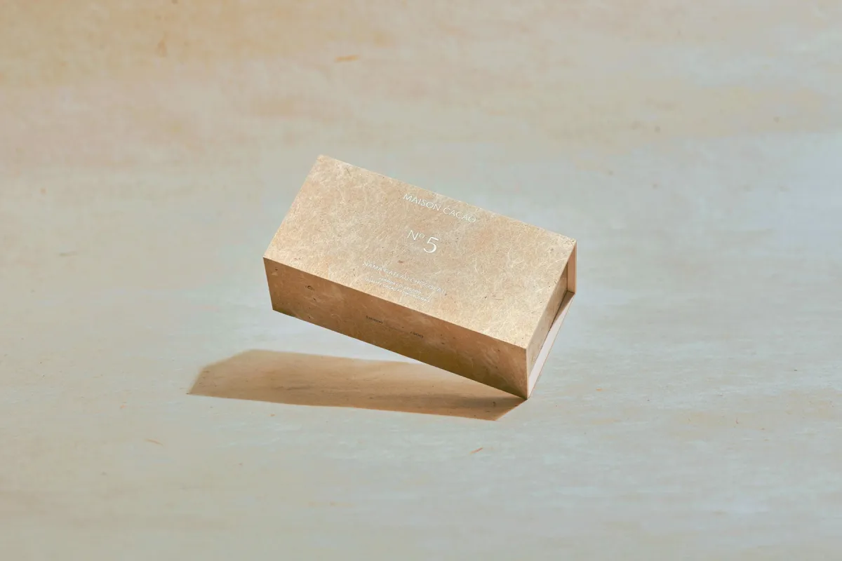 メゾンカカオは、「テロワール」に注目しカカオの持つ特性を最大限に引き出す新たな体験を提供しています。5月の「No.5」は、唯一無二の手漉き和紙を用いたパッケージが魅力です。名尾手すき和紙工房が手掛けたこの和紙は、自然の美しさを表現したもので、梶の木の表皮を漉き込むことで独自の風合いを生み出しています。美しい見た目だけでなく、持っている触感までも楽しむことができる特別な包装です。