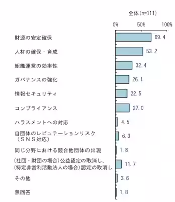 調査の結果、非営利団体が運営上の最も大きな課題として「財源の安定確保」が69.4%、続いて「人材の確保・育成」が53.2%と、どちらも多くの団体が直面している問題です。また、助成先団体が助成期間中に経験したトラブルとしては、「助成事業に関する報告が著しく遅延した」が45.9%を占め、次いで「当該事業の責任者が退職し、事業活動を終了または縮小した」が27.9%とされました。これらの問題により、リスクマネジメントの強化が求められています。