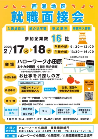 2026年2月17日(火)と18日(水)の2日間、ミナカ小田原で「西湘地区 就職面接会」が開催されます。このイベントは、地元の企業16社が集まり、直接面接や情報交換ができる貴重な機会です。小田原周辺での就職を希望する方にとって、自己PRの場や企業との対話を持つ絶好のチャンスを提供します。