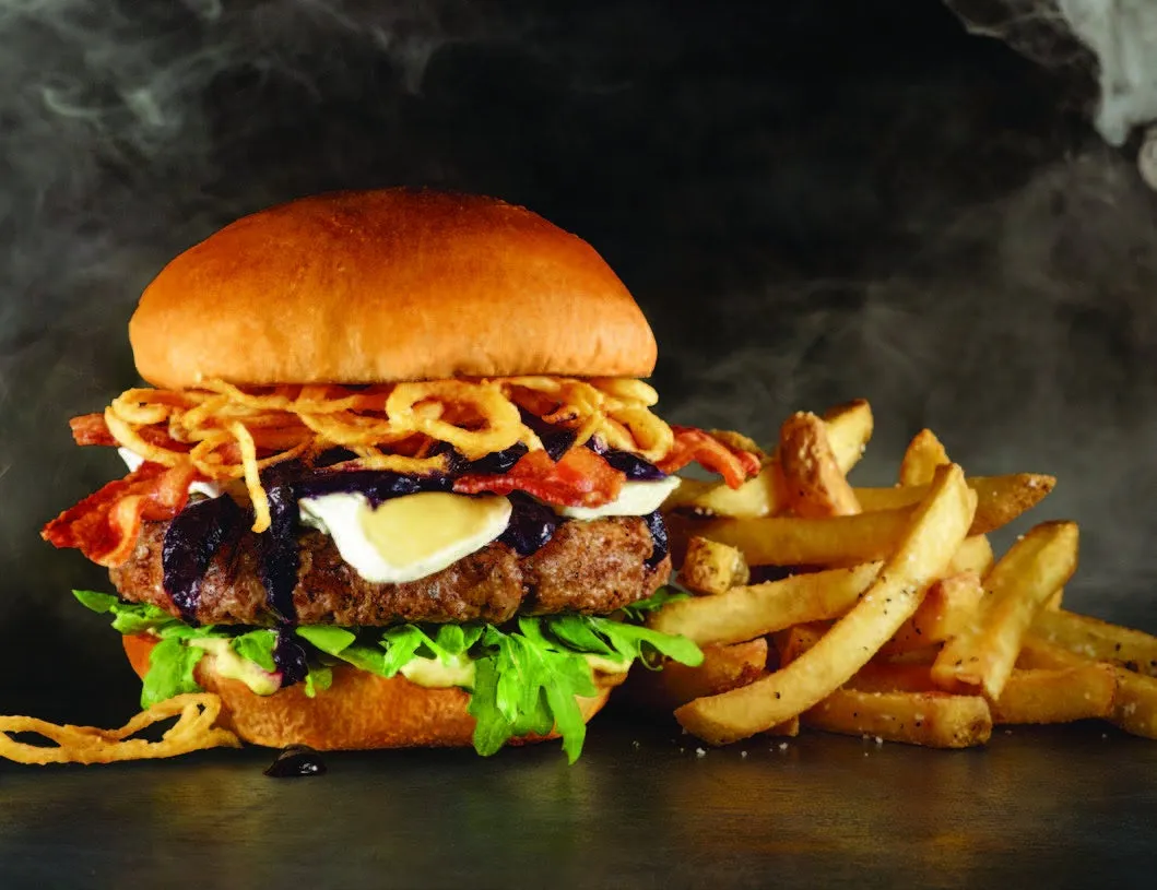 「ブーベリーバーガー」は、マスタードマヨネーズが塗られたバンズに、新鮮なルッコラ、クリーミーなカマンベールチーズ、甘酸っぱいブルーベリーソース、香ばしいベーコン、そしてサクサクのフライドオニオンをトッピングしたハンバーガーです。色とりどりの食材が織りなすハーモニーは、味はもちろん、見た目も楽しませてくれます。特にボリューム感も抜群で、サラリーマンからファミリーまで幅広いお客様に喜ばれています。